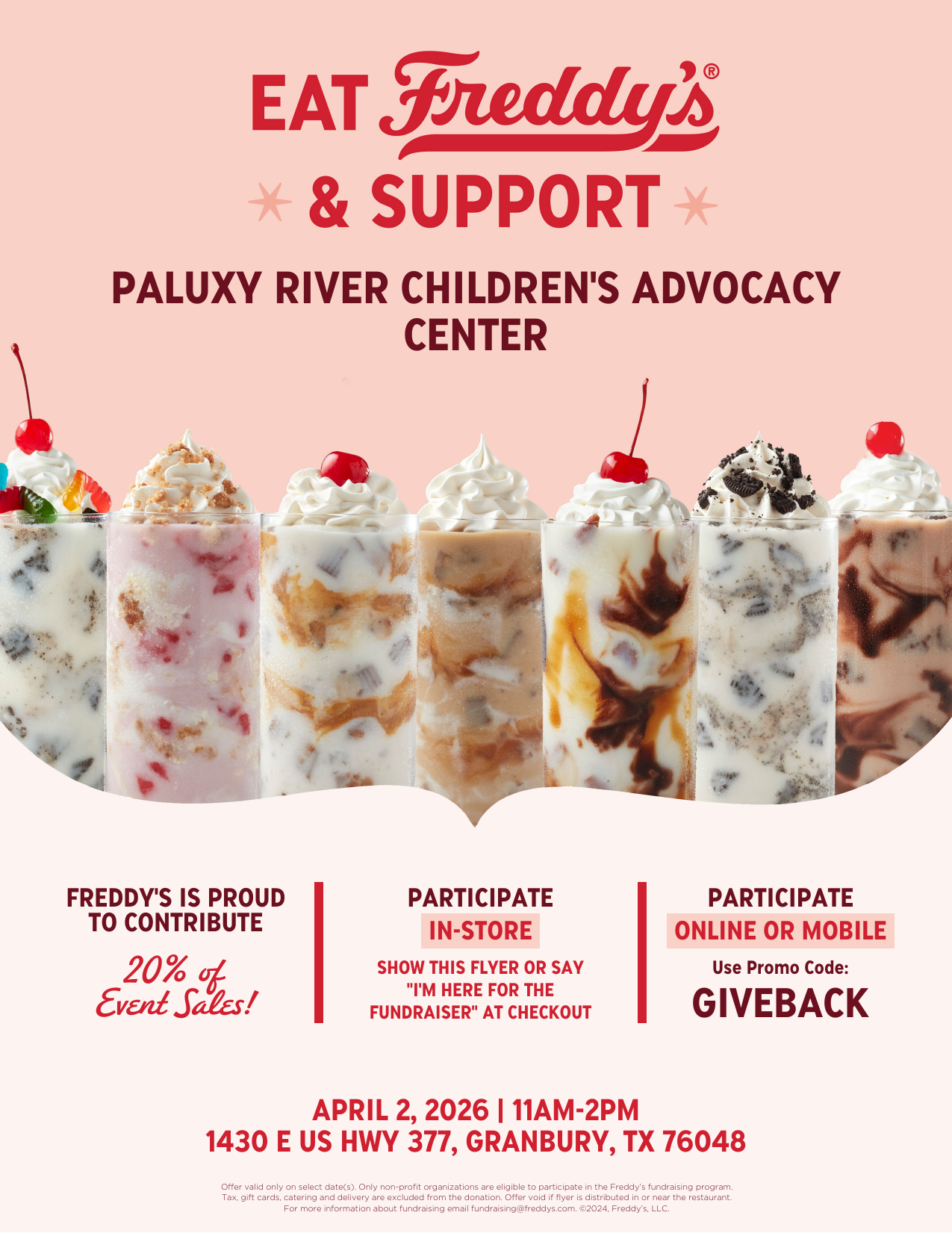 Join us for a delicious way to support local children and families! On April 2, 2026, from 11:00 AM – 2:00 PM, enjoy lunch at Freddy’s Frozen Custard & Steakburgers and help support the Paluxy River Children’s Advocacy Center.